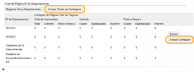 Se pretender repor as contagens a zero, clique na ligação de texto correspondente abaixo de [ID de Departamento] e clique em [Limpar Contagem]  [OK]. Se quiser repor a zeros as contagens de todas as ID de departamento, clique em [Limpar Todas as Contagens]  [OK].