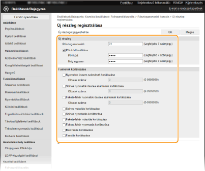 [Funkciók korlátozása] A regisztrálni kívánt részlegek számára korlátozhatja a nyomtatható oldalak számát, valamint az elérhető funkciókat. A nyomtatható oldalak számának korlátozásához válassza ki a jelölőnégyzetet a kívánt típushoz, majd adja meg a számot az [Oldalak száma] mezőben. Jelölje be a korlátozni kívánt funkciókhoz tartozó jelölőnégyzetet.