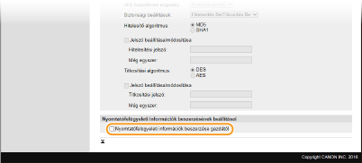 A Kijelölt logikai csoport egy előre beállított csoport, amely kizárólag a Canon szoftvert (például iW Management Console) használó rendszergazdáknak készült. A Kijelölt logikai csoport használatához jelölje be a jelölőnégyzetet, és adja meg a [MIB hozzáférési engedély] értékét. Ha nincs szüksége a kijelölt logikai csoportra, akkor törölje a jelet a jelölőnégyzetből.