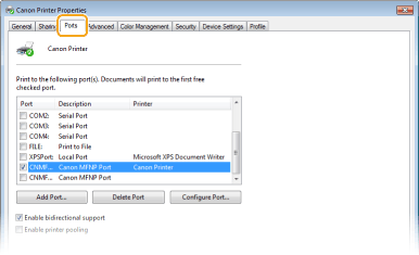 Jeigu pasirinkto prievado [Aprašas] yra [Canon MFNP Port], o aparatas ir kompiuteris yra tame pačiame potinklyje, bus sukurtas ryšys. Nereikia įtraukti naujo prievado. Jei tai yra [Standartinis TCP/IP prievadas], turite įtraukti naują prievadą. Spausdintuvo prievadų konfigūravimas