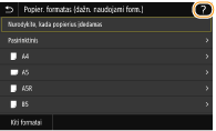 Kai kuriuose ekranuose paspaudę <?> mygtuką galite peržiūrėti funkcijų aprašus arba jų valdymą.