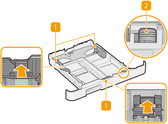 Sureguliuokite popieriaus kreiptuvus tiksliai pagal įdėto popieriaus formatą, kad popierius būtų tiekiamas tiesiai į aparatą. Paspauskite paveikslėliuose rodyklėmis pažymėtas fiksavimo atleidimo svirtis, kad atlaisvintumėte fiksatorius ir pastumtumėte popieriaus kreiptuvus.