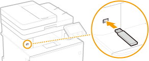 USB atminties įrenginių tvarkymasPrieš įstatydami įsitikinkite, kad USB atminties įrenginys tinkamai orientuotas. Jei bandysite įstatyti netinkamai orientuotą, galite sugadinti atminties įrenginį ir aparatą.