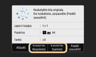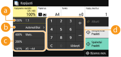 Galima padidinti arba sumažinti kopijas naudojant iš anksto nustatytą kopijavimo mastelį, pvz., <A5->A4>, arba nustatyti pasirinktinį kopijavimo mastelį 1 % žingsniais.