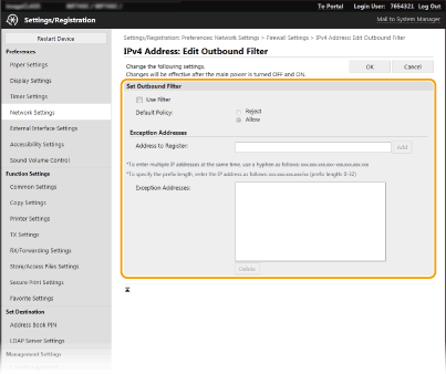 Jei IP adresai bus įvesti neteisingai, gali būti, kad negalėsite pasiekti aparato naudodami priemonę „Remote UI“ (Nuotolinio vartotojo sąsaja). Tokiu atveju parinktį <IPv4 adreso filtras> arba <IPv6 adreso filtras> turėsite nustatyti kaip <Išjung.>.