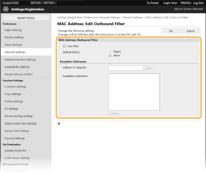 Jei MAC adresai bus įvesti neteisingai, gali būti, kad negalėsite pasiekti aparato naudodami priemonę „Remote UI“ (Nuotolinio vartotojo sąsaja). Tokiu atveju parinktį <MAC adreso filtras> turėsite nustatyti kaip <Išjung.>. <MAC adreso filtras>