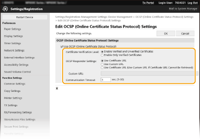 Kai [Use Custom URL] arba [Use Certificate URL (Use Custom URL If Certificate URL Cannot Be Retrieved)] pasirinkti, įveskite OCSP atsakiklio URL (tik ASCII kodas, daugiausia 255 simboliai).