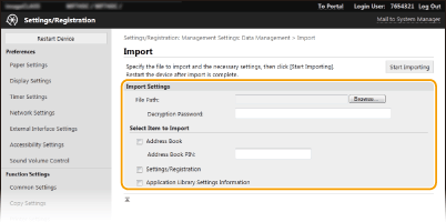 Adresų knygos ir aparato parametrų duomenis galima išsaugoti kompiuteryje (eksportuoti). Kompiuteryje įrašytus duomenis taip pat galima užregistruoti aparate (importuoti). Adresų knygoje esančius adresatus galima nukopijuoti į kitus aparatus.* Norint naudoti šias funkcijas, reikia prisijungti sistemos administratoriaus režimu.