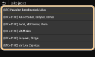 Prieš nustatydami dabartinę datą ir laiką, nustatykite <Laiko juosta>. Jeigu <Laiko juosta> parametras vėliau pakeičiamas, esama data ir laikas taip pat atitinkamai pakeičiami.