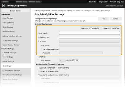 Norėdami prieš siunčiant el. laiškus arba internetines faksogramas konfigūruoti detalius siuntimo ir gavimo parametrus, tokius kaip aparato internetinių faksogramų siuntimo ir gavimo parametrai bei POP autentifikavimo ir ryšio šifravimo parametrai, naudokite priemonę „Remote UI“ (Nuotolinio vartotojo sąsaja). Reikiamų parametrų kreipkitės į paslaugų teikėją ar tinklo administratorių.