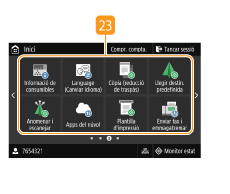 Premeu-la per comprovar l'estat d'impressió, per veure l'historial d'ús o per visualitzar les opcions de xarxa, com ara l'adreça IP de l'equip. També podeu comprovar l'estat de l'equip, com ara la quantitat de paper i de cartutxos de tòner que queda o si s'ha produït algun error. Pantalla <Monitor d'estat>