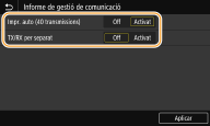 Seleccioneu <Activat> per imprimir l'informe automàticament cada 40 transmissions, o bé <Desact.> si no voleu imprimir-lo de manera automàtica.