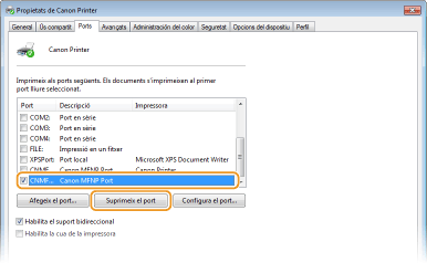 No es pot eliminar un port configurat com a port d'impressora. Per eliminar aquest port, seleccioneu un port diferent i feu clic a [Aplica] per configurar-lo com el nou port d'impressora i després elimineu el port original.