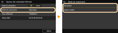 Ethernet és un estàndard del per comunicar dades en una xarxa d'àrea local (LAN). Podeu establir el mode de comunicació i el tipus d'Ethernet. En general, l'equip es pot utilitzar sense canviar els valors predeterminats (<Opcions del controlador Ethernet>), però podeu canviar aquestes opcions perquè s'ajustin al vostre entorn de xarxa.