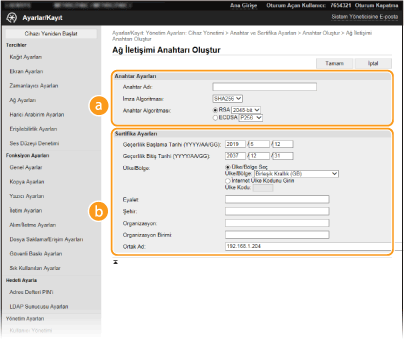 Aktarım Katmanı Güvenliği (TLS) aracılığıyla şifrelenmiş iletişim için gerektiğinde, makine ile bir anahtar ve sertifika oluşturulabilir. Makineye Uzak Kullanıcı Arabirimi aracılığıyla erişirken TLS'yi kullanabilirsiniz. "Ağ İletişimi" içinde oluşturulan anahtar ve sertifika ile kendiliğinden imzalı sertifikalar kullanılır.
