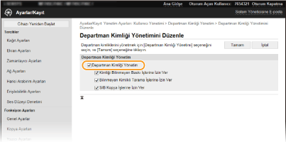 Onay kutusu seçiliyse, ana ekranda <Bilgisayar> veya <Uzak Tarayıcı> öğesini seçebilirsiniz ve belgeleri bilgisayara istediğiniz zaman tarayabilirsiniz. Onay kutusu seçili değilken Departman Kimliği Yönetimi etkinleştirilmişse, belgeleri bilgisayara tarayamazsınız. Farklı departman kimlikleri için bilgisayara belge taramanın kısıtlanması mümkün değildir.