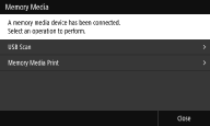 اگر <Screen When Mem. Med. Conn> روی <On> تنظیم شده باشد، وقتی در حین نمایش صفحه Home دستگاه حافظه USB متصل میکنید، کنشهای در دسترس نمایش داده میشود. <Screen When Mem. Med. Conn>
