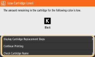 میتوانید مقداری را به عنوان درصد باقیمانده کارتریج تونر تنظیم کنید تا پیامی نمایش داده شود. <Display Timing for Cart. Prep.>
