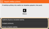 Εάν εμφανιστεί μήνυμα για την κασέτα μαύρου γραφίτη ενώ η συσκευή λαμβάνει φαξ/I-Φαξ ή ενώ έχετε επιλέξει να γίνεται αυτόματη εκτύπωση των αναφορών, τα ληφθέντα φαξ και οι αναφορές θα αποθηκευτούν στη μνήμη, έτσι ώστε να μην εκτυπωθούν αχνά. Για να συνεχίσετε να εκτυπώνετε ακόμη και όταν κοντεύει να εξαντληθεί ο γραφίτης, ορίστε τη ρύθμιση <Συνέχ. εκτύπ. Με χαμ. στάθμη> στην επιλογή <On>. <Συνέχ. εκτύπ. Με χαμ. στάθμη>