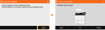 Pri nekaterih vrstah napak se prikažejo navodila za odpravljanje napake. Težavo odpravite po navodilih na zaslonu. Spodaj je kot primer prikazan zaslon, ki se prikaže v primeru zastoja papirja.