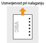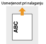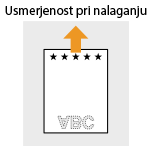 To poglavje v glavnem opisuje nalaganje potiskanega papirja v pravi smeri in postavitvi. Za opis splošnega postopka nalaganja papirja v predal za papir ali režo za ročno podajanje glejte Nalaganje papirja v kaseto za papir ali Nalaganje papirja v režo za ročno podajanje.