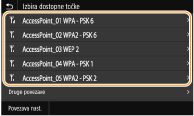 Poiščete lahko brezžične usmerjevalnike (ali dostopne točke), ki so na voljo za povezavo, in z zaslona naprave izberete želenega. Za omrežni ključ vnesite šifrirni ključ/geslo. Preden izberete brezžični usmerjevalnik, preverite in si zapišite zahtevane namestitvene podatke, vključno s SSID-jem in omrežnim ključem (