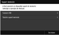 Dacă <Ecran la conect. sup. memorie> este setat la <Pornit>, acțiunile disponibile sunt afișate atunci când introduceți un dispozitiv USB de memorie, în timp ce este afișat ecranul Pornire. <Ecran la conect. sup. memorie>