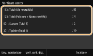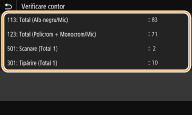 Puteţi verifica separat numărul total de pagini utilizate pentru documentele imprimate color şi pentru documentele imprimate alb-negru. Acest număr total include faxuri, rapoarte şi liste, în plus faţă de copii şi documente imprimate de date de la computere.