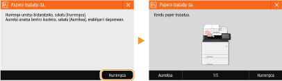 Hainbat kasutan, errore bat gertatzen denean, erroreari erantzuna emateko argibideak bistaratzen dira. Jarraitu pantailako argibideei errorea konpontzeko. Adibide gisa, ondoren papera trabatzen denean bistaratzen den pantaila agertzen da.