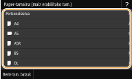 Goian agertzen den pantaila bistaratzen ez bada papera kargatzeanEskuz kargatzeko erretenean beti paper bera kargatzen baduzu, paperaren ezarpen-eragiketak saihesteko aukera duzu paper-tamaina eta mota ezarpen lehenetsi gisa erregistratuz. Ezarpen lehenetsia erregistratzen baduzu, ordea, ez da goiko pantaila bistaratuko. Pantaila bistaratzeko, hautatu <Zehaztu papera kargatzean> (Eskuz kargatzeko erretenarentzako paper-ezarpen lehenetsiak erregistratzea).