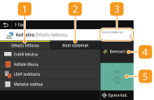 Eskaneatutako datuak I-fax bidez bidaltzen ditu. Posta elektronikoa bidaltzeko/I-faxak bidaltzeko/fitxategiak gordetzeko oinarrizko funtzioen pantaila
