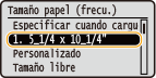 Los tamaños de papel que se registren con el procedimiento anterior se muestran en la pantalla de selección de tamaño de papel para el casete de papel o la ranura de alimentación manual.