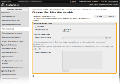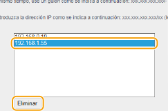 Cuando se selecciona [Rechazar] para un filtro de salida Los paquetes de difusión y multidifusión de salida no pueden filtrarse. Eliminación de una dirección IP de las direcciones excluidas Seleccione una dirección IP y haga clic en [Eliminar]. ![]() | ||||||||||||||