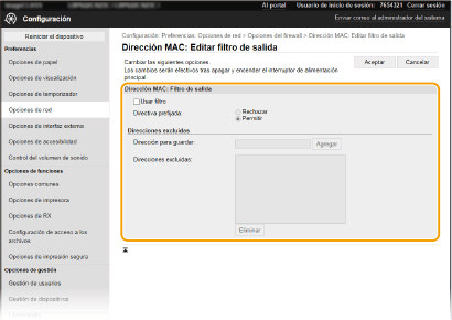 2 | Especifique las direcciones excluidas. Introduzca la dirección MAC en el cuadro de texto [Dirección para guardar] y haga clic en [Agregar]. No tiene por qué delimitar la dirección con guiones ni dos puntos. ![]() Comprobación de los errores de entrada Si las direcciones MAC se introducen de forma incorrecta, es posible que no pueda acceder al equipo desde la IU Remota, en cuyo caso deberá establecer <Filtro de direcciones MAC> en <Off>. <Filtro de direcciones MAC> ![]() Cuando se selecciona [Rechazar] para un filtro de salida Los paquetes de difusión y multidifusión de salida no pueden filtrarse. Eliminación de una dirección MAC de las excepciones Seleccione una dirección MAC y haga clic en [Eliminar]. ![]() | ||||