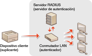 El equipo puede conectarse a una red 802.1X como dispositivo cliente. Una red 802.1X normal está formada por un servidor RADIUS (servidor de autenticación), un conmutador LAN (autenticador) y dispositivos cliente con software de autenticación (suplicantes). Si un dispositivo intenta conectarse a la red 802.1X, el dispositivo deberá autenticar al usuario para demostrar que la conexión pertenece a un usuario autorizado. La información de autenticación se envía y se comprueba a través de un servidor RADIUS, que permite o rechaza la comunicación con la red en función del resultado de la autenticación. Si en la autenticación no se obtienen los resultados esperados, un conmutador LAN (o un punto de acceso) bloquea el acceso desde el exterior de la red.