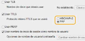 1 | Seleccione la casilla de verificación [Usar TTLS] o [Usar PEAP]. Protocolo interno para TTLS Puede seleccionar MSCHAPv2 o PAP. |