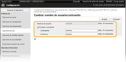3 | Establezca el nombre de usuario/contraseña. [Nombre de usuario] Introduzca caracteres alfanuméricos en el nombre de usuario. [Cambiar contraseña] Para configurar o cambiar la contraseña, marque la casilla de verificación e introduzca caracteres alfanuméricos para la nueva contraseña en los cuadros de texto [Contraseña] y [Confirmar]. |