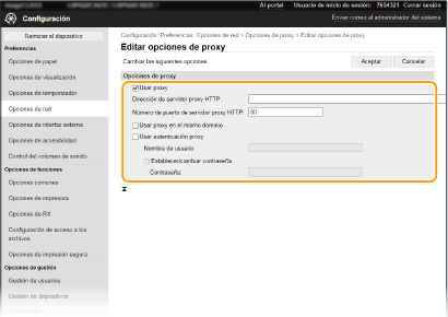 Seleccione la casilla de verificación [Usar proxy] y especifique las opciones necesarias.