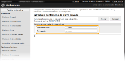 2 | Introduzca el nombre de la clave y la contraseña. [Nombre de clave] Introduzca caracteres alfanuméricos para el nombre de la clave que va a registrar. [Contraseña] Introduzca caracteres alfanuméricos para la contraseña de la clave privada establecida en el archivo que va a registrar. |