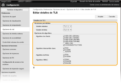Especifique la [Versión máxima] y la [Versión mínima] de TLS.