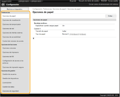 Puede cambiar las distintas opciones del equipo utilizando la IU remota. La mayoría de las opciones también pueden configurarse en el equipo, pero algunas opciones solo pueden configurarse a través de la IU remota. En esta sección se describe el flujo básico de cambio de las opciones del equipo a través de la IU remota.