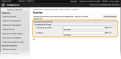 Introduzca una contraseña para cifrar los datos exportados con caracteres alfanuméricos. Introduzca la misma contraseña en [Confirmar]. Para exportar los datos, deberá establecer una contraseña de cifrado.