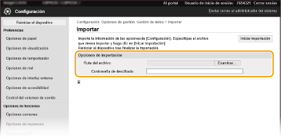 Cargue (importe) los datos exportados desde el equipo. También puede importar opciones del equipo desde otro equipo al suyo si son del mismo modelo.