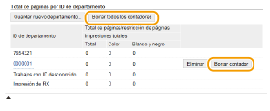 Si desea poner a cero todos los recuentos, haga clic en el vínculo de texto correspondiente situado debajo de [ID de departamento] y haga clic en [Borrar contador]  [Aceptar]. Si desea poner a cero los recuentos de todos los ID de departamento, haga clic en [Borrar todos los contadores]  [Aceptar]. |