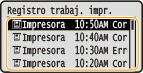 Si <Mostrar registro de trabajos> está establecido en <Off>, no podrá consultar los registros de impresión. <Mostrar registro de trabajos> |