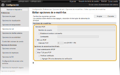 Seleccione la casilla de verificación para cifrar la comunicación con el servidor POP3 mediante TLS. Seleccione la casilla de verificación de [Verificar certificado] o [Agregar CN a los elementos de verificación] en función de sus necesidades.