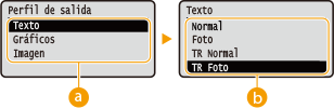Aunque esté seleccionado <On>, los datos se imprimen usando solamente el tóner K (negro) dependiendo de la opción <Perfil de salida> o <Texto negro puro>.