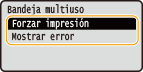 <Bandeja multiuso> <Forzar impresión> <Mostrar error>  <Casete 1> <Forzar impresión>  <Mostrar error> |