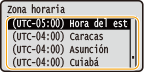 Configure <Zona horaria> antes de configurar la fecha y la hora actuales. Si la opción <Zona horaria> se modifica más tarde, la fecha y la hora actuales también se modificarán. |