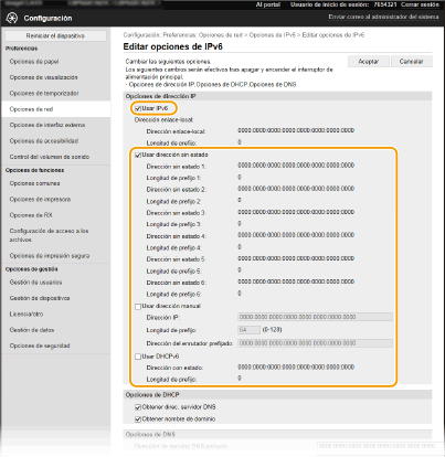 Dirección manual | Dirección que se introduce manualmente. Cuando utilice esta dirección, especifique la longitud del prefijo y la dirección del router predeterminada. |